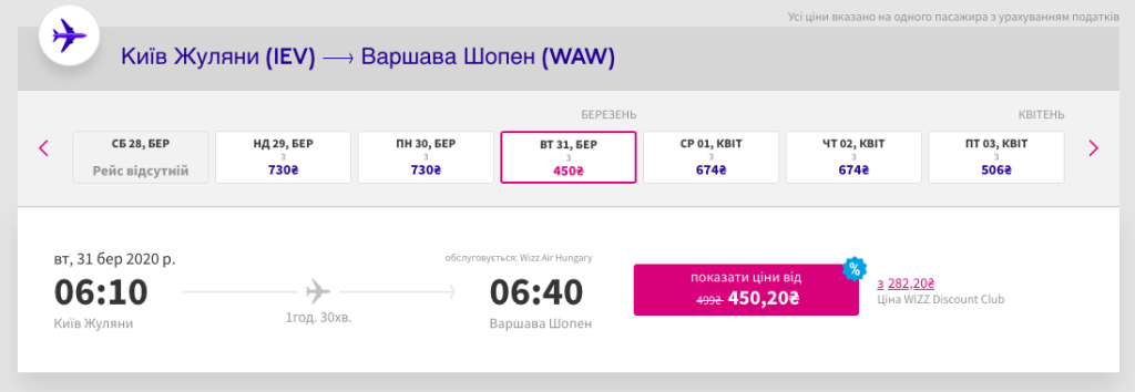 Київ – Варшава (31.03.2020) – €9,99 для WDC та €16,9 для всіх