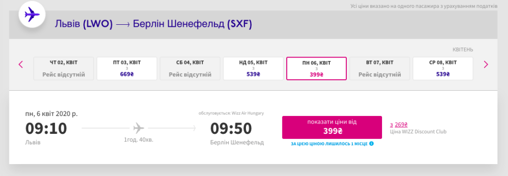 Львів – Берлін (6.04.2020) – €9,8 для WDC та €14,8 для всіх