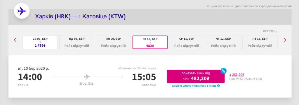 Харків – Катовіце (10.03.2020) – €9,8 для WDC та €18 для всіх