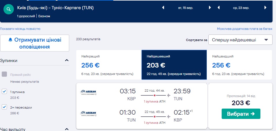 Вартість квитків з Києва у Туніс – від €183 в обидві сторони. Рейси здійснюють з довгими пересадками в Греції, тому, ще буде час подивитись Афіни.