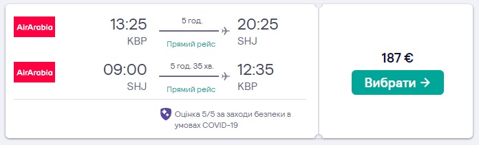 Прямі рейси Київ – Шарджа – від €187 в обидві сторони. В найнижчих тарифах – тільки ручна поклажа до 10 кг (55×20×40 см). Вигідні варіанти для перельотів можна знайти на період новорічних та різдвяних свят.