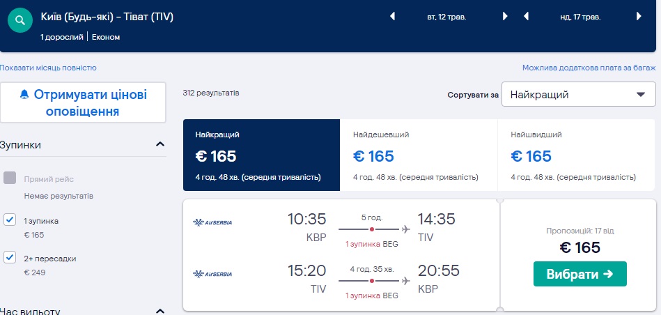 Вартість квитків на переліт з Києва у чорногорське місто Тіват – від €165 в обидві сторони. Рейси здійснюються з пересадками у Белграді.