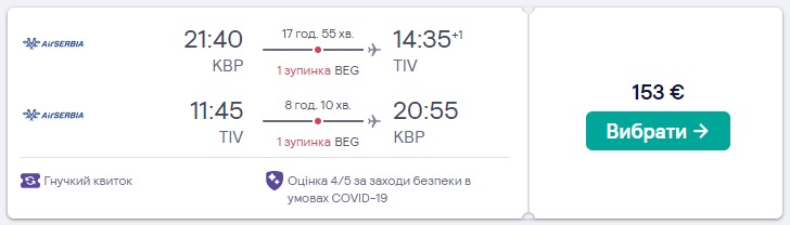 Авіакомпанія Air Serbia знизила ціну на перельоти між Україною та Чорногорією. Вартість квитків Київ-Тиват – від €153 в обидві сторони за умови подорожі з ручною поклажею. Рейси здійснюються з пересадками у Белграді.