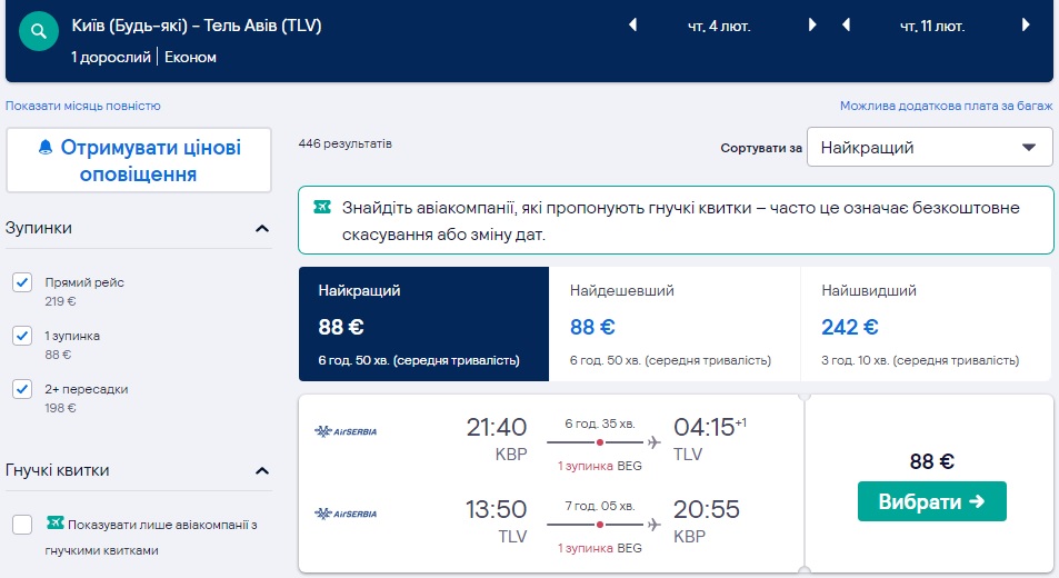 Вартість квитків з Києва у Тель-Авів – від €88 в обидві сторони. Рейси здійснюються з пересадками у Белграді.