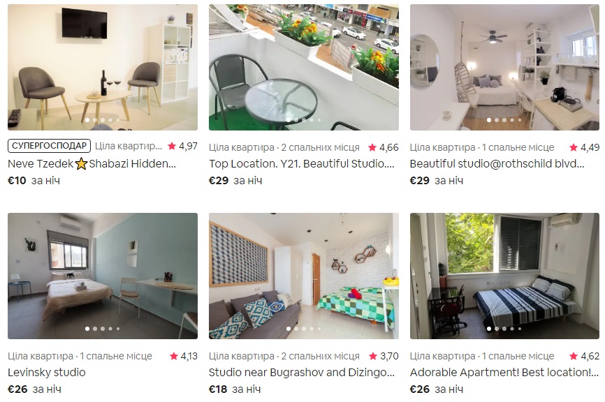 Приклади бронювання житла у Тель-Авіві на період 29.10.2020 — 05.11.2020, 7 ночей: