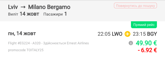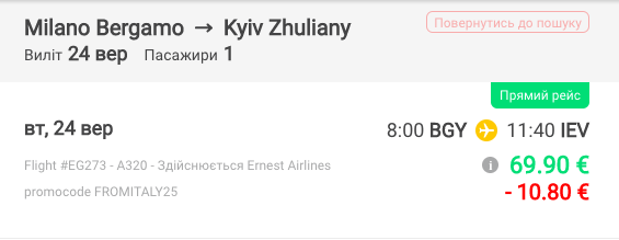 Промокод FROMITALY25 – діє тільки на подорожі в одну сторону з Італії на рейсах Ernest Airlines з вильотом в період з 22 серпня до 28 жовтня 2019.