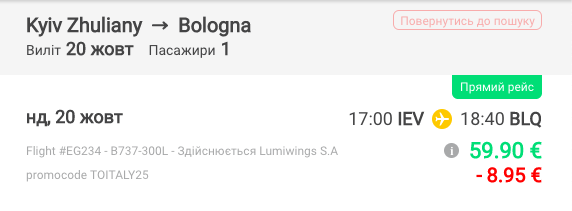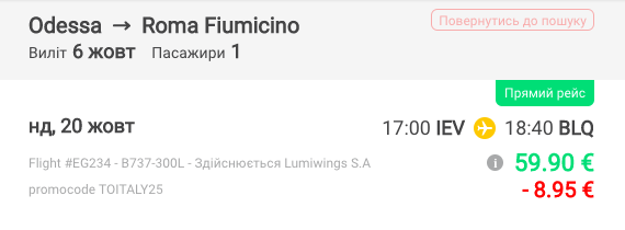 Приклади напрямів та цін в один бік з України до міст Італії: