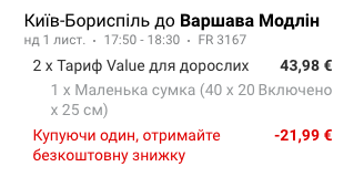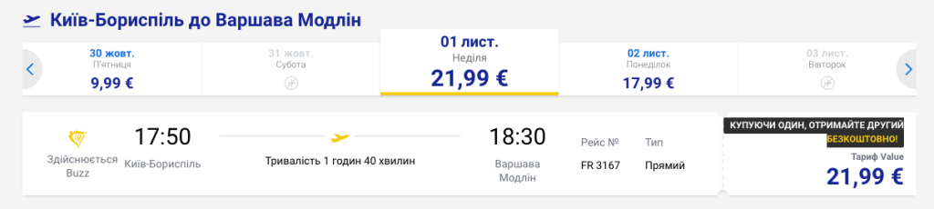 Акція діє до закінчення акційних місць, діє на лише на деякі рейс та розповсюджується на тариф Value. Щоб отримати другий квиток безкоштовно, потрібно забронювати 2 та більше квитків.Купуючи один квиток за тарифом Value, Ви отримуєте другий квиток безкоштовно на тому ж самому рейсі. Але є й обмеження: за будь-яке внесення змін щодо рейсів у бронюванні, оформленому під час акції «Купуючи один, отримайте другий безкоштовно» (до 24 вересня), стягується збір за зміну рейсу.