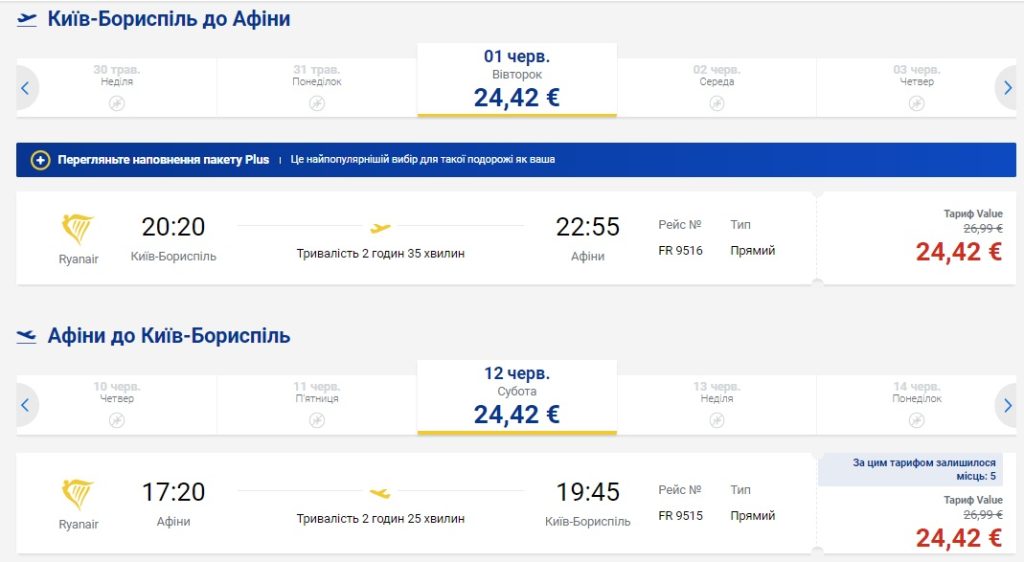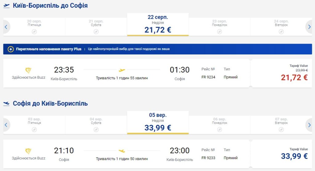 В ціні за даними тарифами – тільки ручна поклажа. Замовляти квитки потрібно на сайті Ryanair.