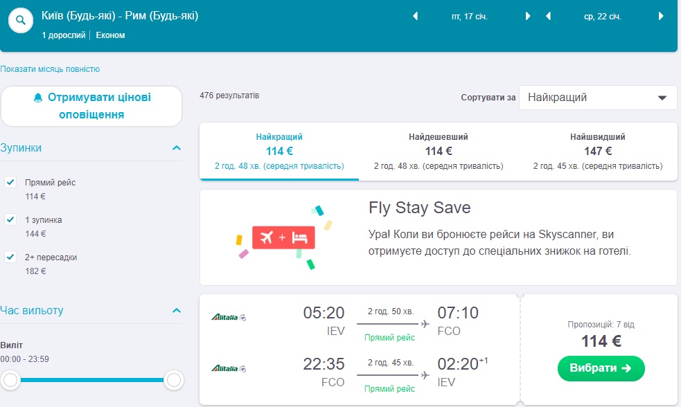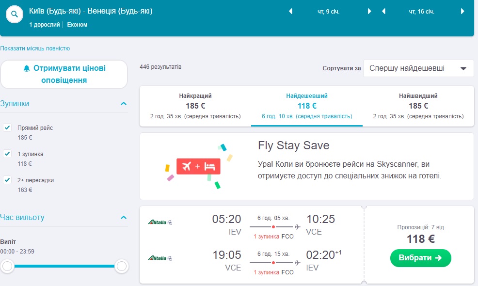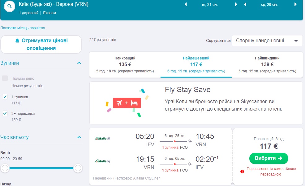 Замовляти квитки потрібно на сайті Alitalia, більше варіантів для майбутніх мандрівок можна пошукати на Kiwi.com або Skyscanner.com.
