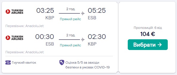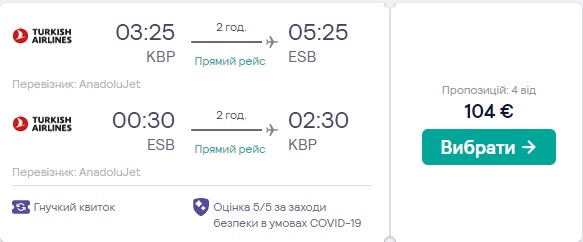 Вартість квитків Київ – Анкара – від €58 в одну сторону або €104 туди-назад. В найдешевших тарифах – тільки ручна поклажа до 8 кг.