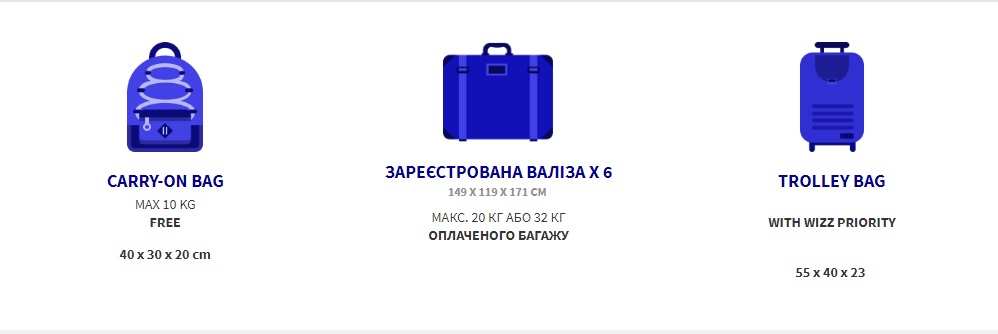 Якщо ви не придбали послугу WIZZ Priority і ваша ручна сумка більше розмірів  – 40x30x20 см з вас буде стягнуто збір €25 за перевищення розмірів багажу.