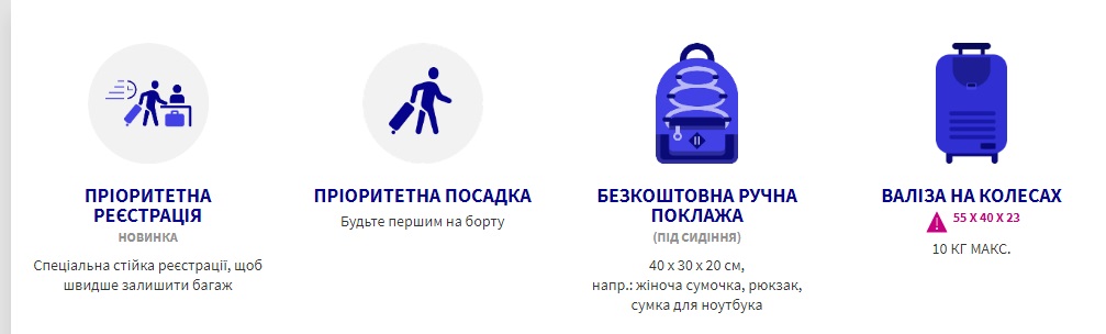 З послугою WIZZ Priority можна буде додатково у салон взяти одну валізу на колесах,  розміром не більше – 55 x 40 x 23 см. Придбати послугу можна на сайті Wizz air (5-12 євро), в аеропорту – €25.