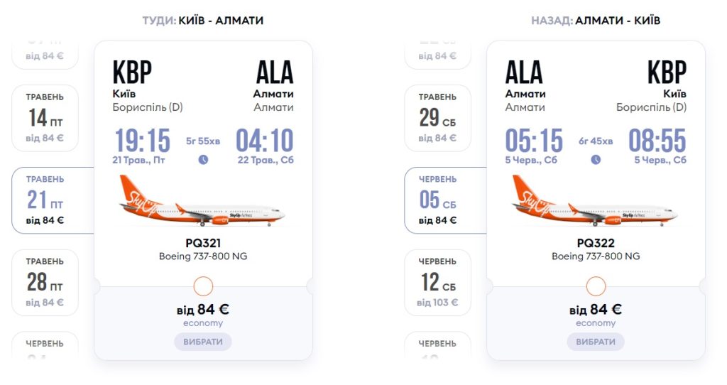 Казахстанська авіакомпанія знизила ціни майже двічі від своєї звичайної вартості квитків – від €201 в обидві сторони. У SkyUp Airlines прямі рейси Київ – Алмати – від €84 в один бік або €168 туди-назад.