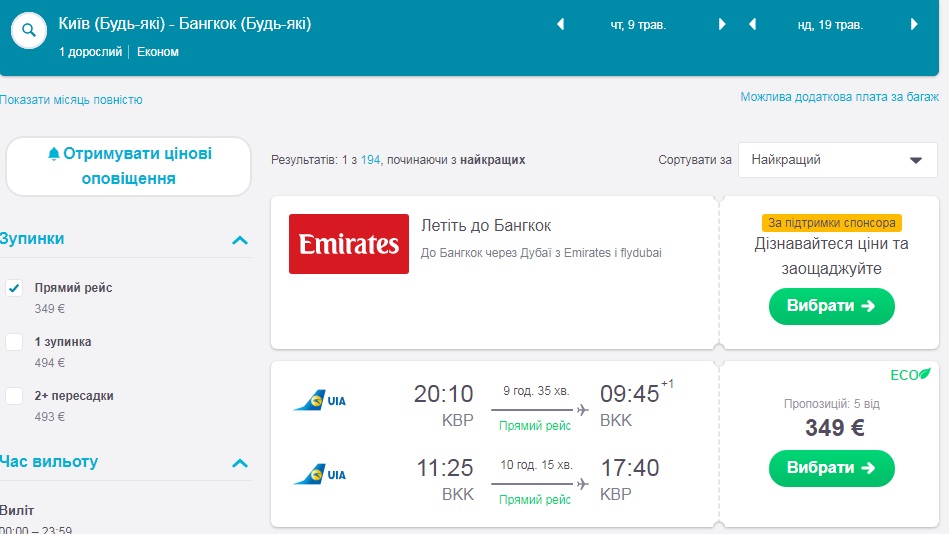 Акція від авіакомпанії МАУ на переліт в Таїланд на квітень-липень 2019 року. Прямі рейси Київ-Бангкок від €349 туди-назад. Скористатись акцією потрібно до 15 листопада 2018.