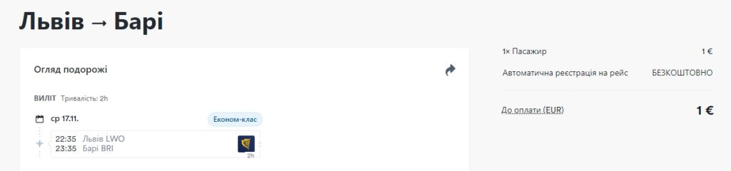 Рейси у Барі, Пізу, Турин та Ригу за €1 в один бік. В ціну включено тільки ручну поклажу та безплатну автоматичну реєстрацію на рейс.