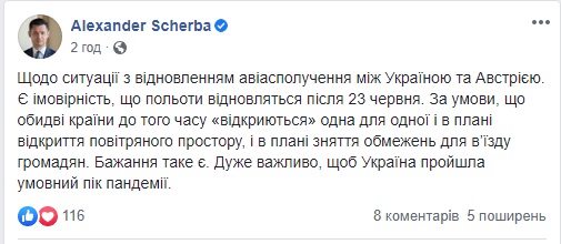 “Щодо ситуації з відновленням авіасполучення між Україною та Австрією. Є імовірність, що польоти відновляться після 23 червня. За умови, що обидві країни до того часу “відкриються” одна для одної і в плані відкриття повітряного простору, і в плані зняття обмежень для в’їзду громадян” – написав посол.