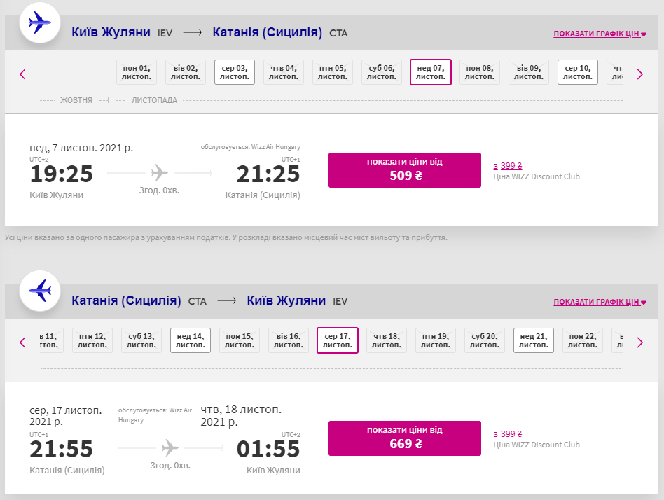 Wizz Air: Київ – Катанія – Київ (07.11.2021 – 17.11.2021) – €37