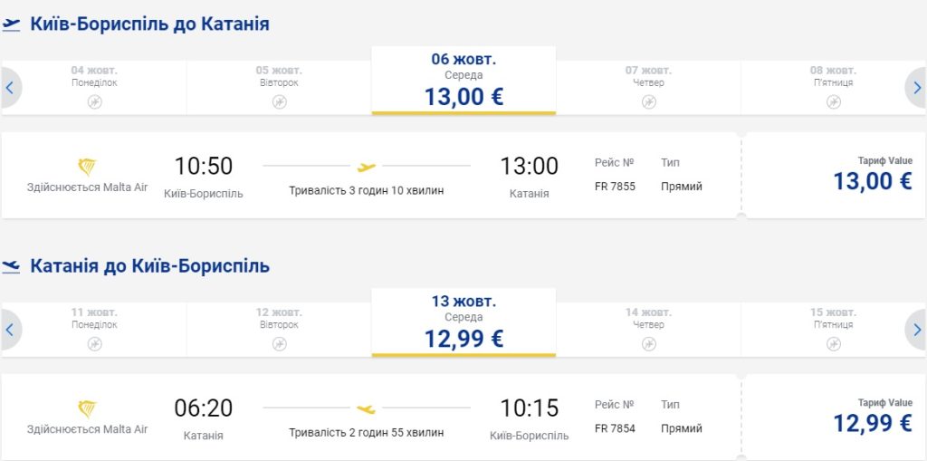 Ryanair: Київ – Катанія – Київ (06.10.2021 – 13.10.2021) – €26