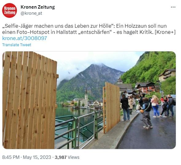 Місцеві скаржаться, що туристи натовпами збираються на локації, з якої відкривається знаменитий краєвид на міську церкву Гальштата, який часто зображають на листівках. В результаті там неможливо пройти.
