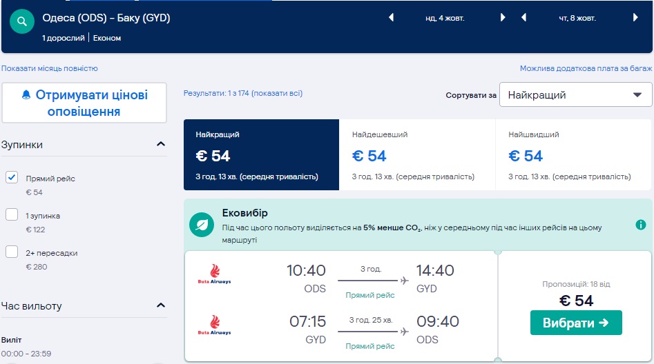 У Buta Airways можна знайти дешеві варіанти для перельотів з Харкова та Одеси у Баку – від €54 в обидві сторони.