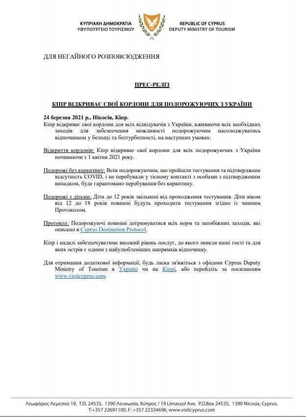 Про це йдеться в пресрелізі Міністерства туризму Кіпру 24 березня 2021.