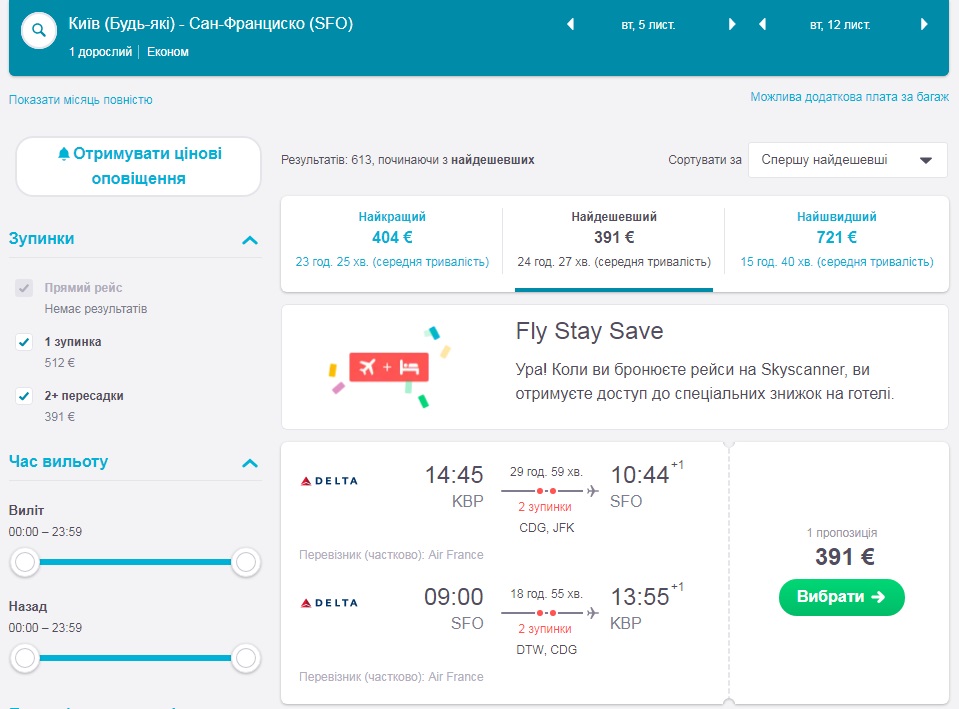 Дешеві рейси з Києва у Сан-Франциско здійснюються з пересадками у Парижі або Амстердамі (рейси частково здійснює Air France) та короткими стиковками у різних містах США.