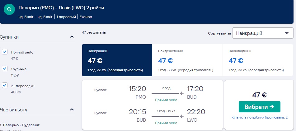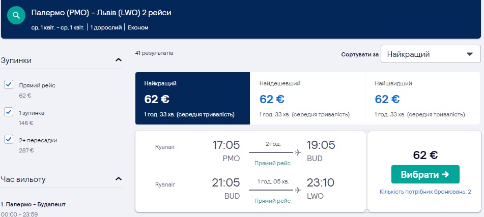 Палермо-Будапешт-Львів (01.04.2020) – €62
