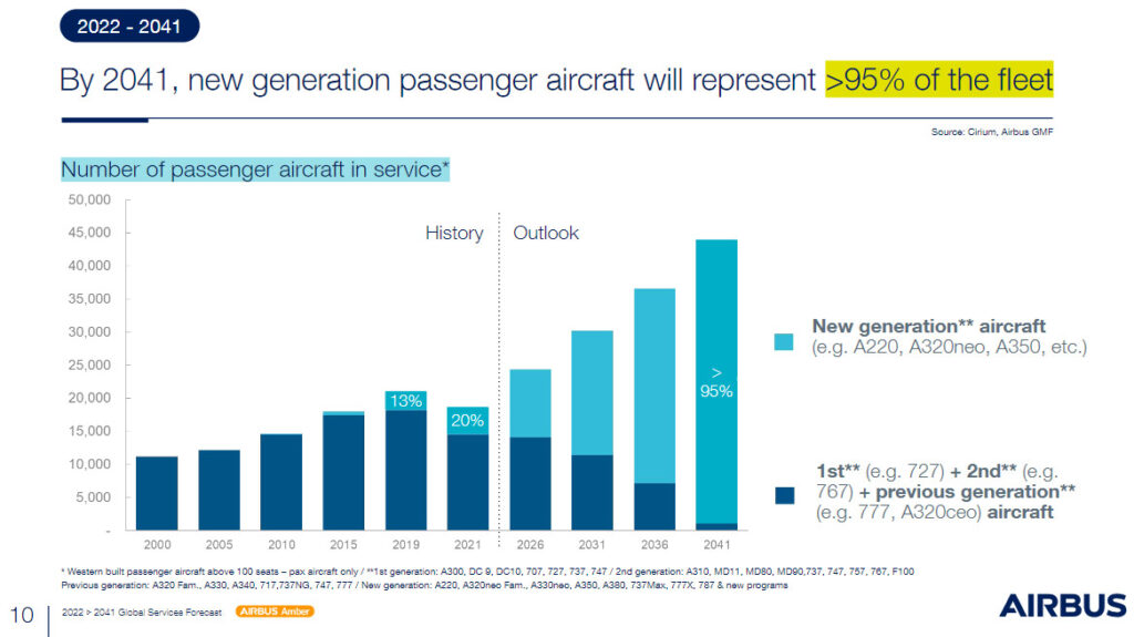 У 2021 році доля сучасної техніки складала 20% серед усіх літаків західного виробництва. За 20 років авіакомпанії продовжать використання лиши третини літаків попереднього покоління, інші будуть відправлені на утилізацію. Завдяки цьому та зростанню постачання сучасних авіалайнерів, доля застарілої техніки до 2041 року зменшиться до 5%.