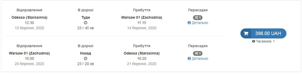 Одеса-Варшава-Одеса (13.03.2020 – 20.03.2020) – ₴398