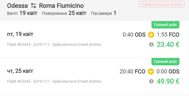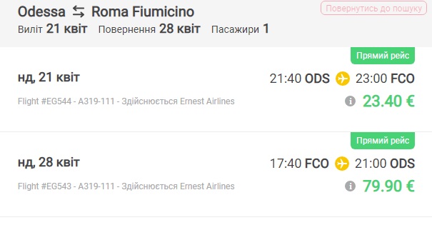 Італійська авіакомпанія Ernest Airlines запустила у продаж квитки на прямі рейси з Одеси у Рим – від €23 в один бік у квітні 2019.