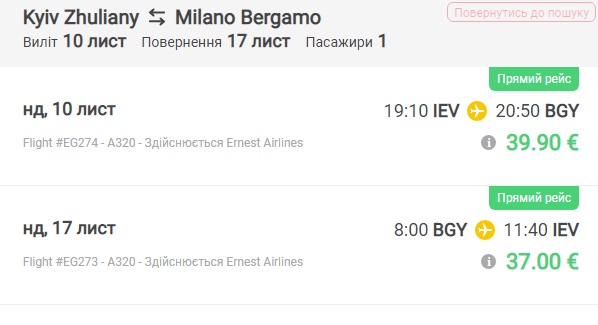 Київ-Мілан-Київ (10.11.2019 – 17.11.2019) – €77