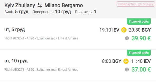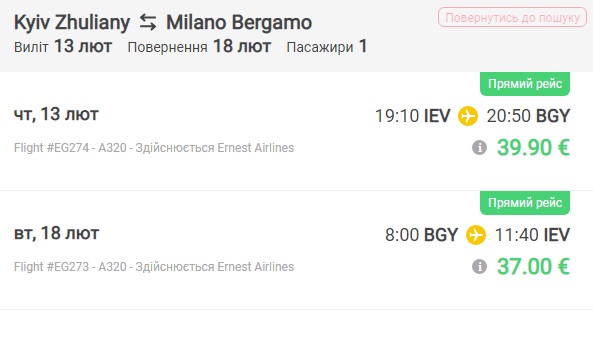 Італійський лоукост Ernest Airlines знизив ціну на прямий переліт з Києва у Мілан на зимовий період.