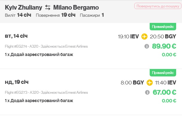 Київ-Мілан-Київ (14.01.2020 – 19.01.2020) – €157