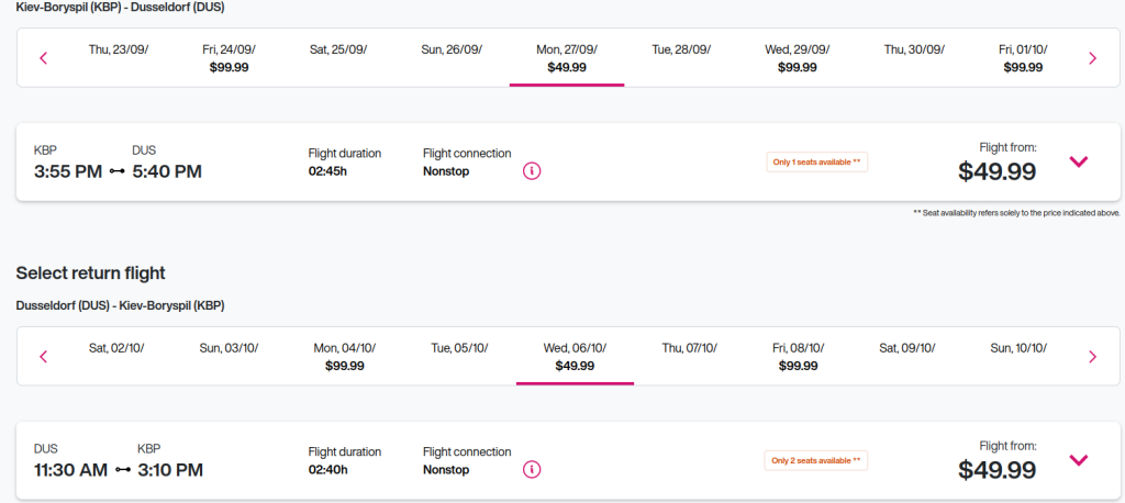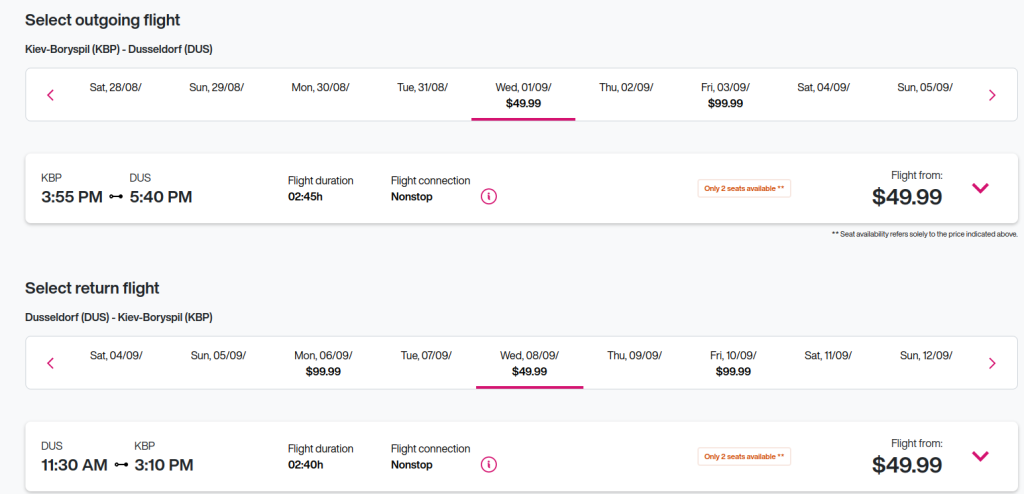 Рейси Київ – Дюссельдорф планують виконувати тричі на тиждень – щопонеділка щосереди та щоп’ятниці. Вартість квитків – від $50 в один бік або $100 туди-назад. В найдешевших тарифах – тільки ручна поклажа до 8 кг.