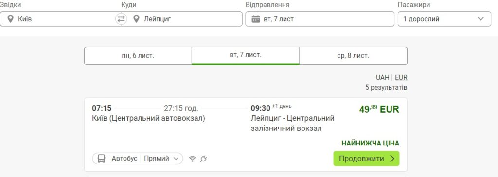Приклад бронювання квитків на автобус Київ – Лейпциг: