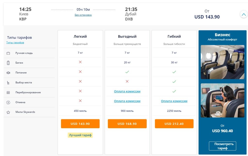 Окрім цього, flydubai пропонує такі тарифні плани економкласу: “Вигідний” з багажем до 20 кг та харчуванням або “Гнучкий” з харчуванням, багажем до 30 кг, вибором місця та можливістю безкоштовної зміни дати вильоту.