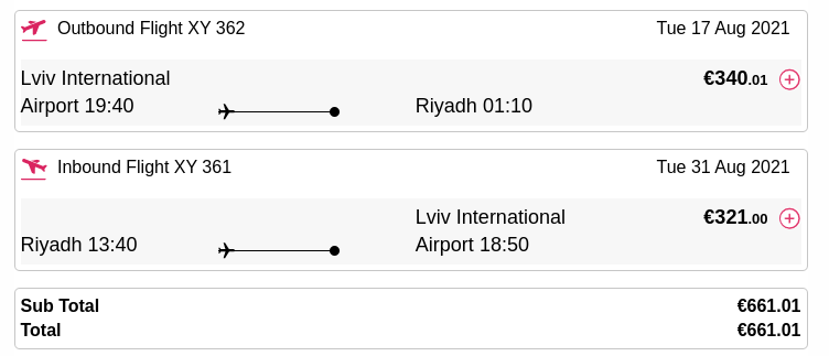 Львів – Ер-Ріяд – Львів (17.08.2021 – 31.08.2021) – €661