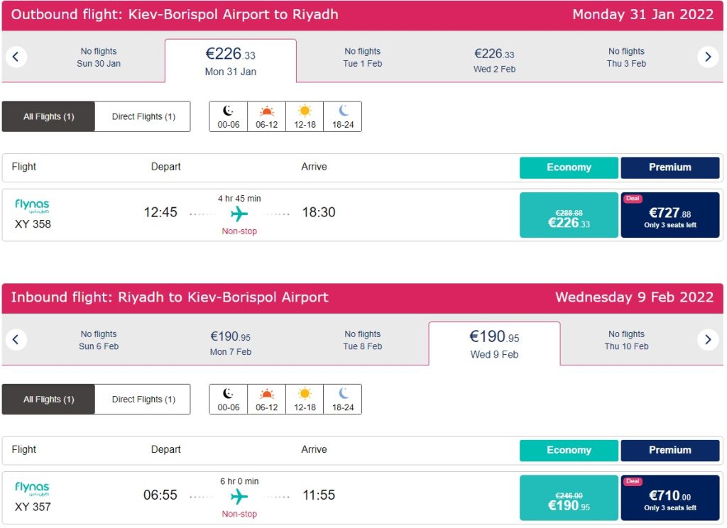 Київ – Ер-Ріяд – Київ (31.01.2022 – 09.02.2022) – €416