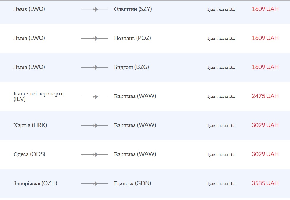 В ціні на квитки у Польщу подорож тільки з ручною поклажею, для перельотів в Азію та Америку дозволяється безкоштовний зареєстрований багаж до 23 кг.