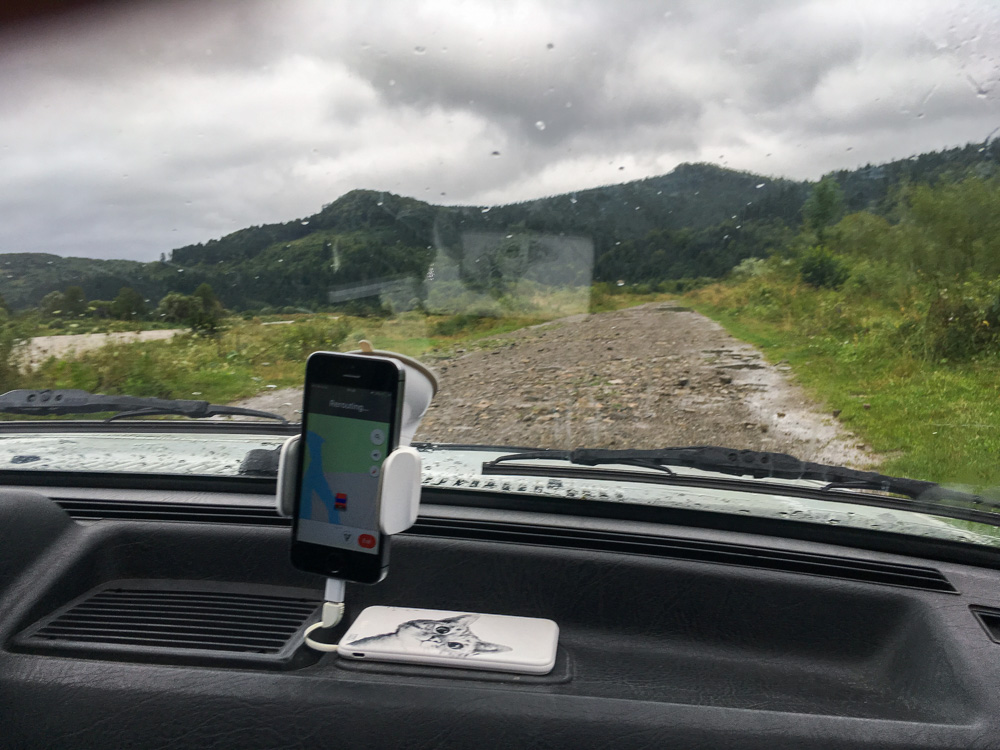- Зв’язок. Якщо у Вас лайфселл, як він був у нас – просто забудьте про зв’язок і гуглмапси. Мережа закінчується у більш-менш великих містечках, а в селах чи горах – навіть не шукайте (ми хіба тільки на смереки не вилазили). Неодноразово через цю проблему нам доводилося повертатися до останньої точки сигналу, скріншотити карти, а потім один з нас був у ролі штурмана. Одного разу дуже виручив водафон, який довелося переставити зі старенького запасного телефона у смартфон, в тональному режимі поповнити банківською карткою, аби підключити інтернет, і, таким чином, ми зекономили години три часу, який витратили б на блукання в пошуках вірного шляху (фото якраз з того моменту).