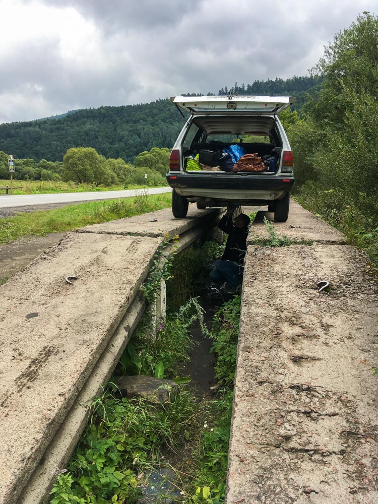 - Бійтеся зламатися в Карпатах, кермуйте уважно та обережно, і горе вам, якщо ви проігнорували попередній пункт. Ох, надивилися ми в дорозі на нещасних уздовж узбіччя з піднятими капотами та розваленою ходовою. Наспілкувалися з ними біля їхніх напіврозібраних залізних коней на СТО. Так, саме при спуску з Полонини Руни ми відірвали глушник і потребували звичайного підйомника чи естакади для його монтажу. По-перше, важко знайти запчастини (навіть звичайні кріплення потрібного типу) з сьогодні-на сьогодні. По-друге, черга запису на СТО – як до лікаря стоматолога. По-третє, на якісь дивні церковні свята (не державного значення) – деякі СТО не працюють. Бо свято ж. Врешті, конкретно ми змушені були знайти закинуту автобазу і ми власноруч вдвох все полагодили.