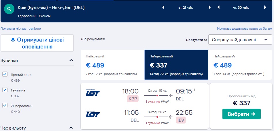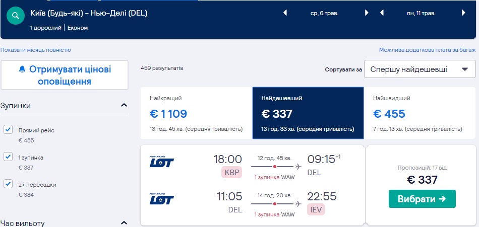 Вартість квитків з Києва у Нью-Делі – від €337 в обидві сторони. Рейси здійснюються з пересадками у Варшаві.