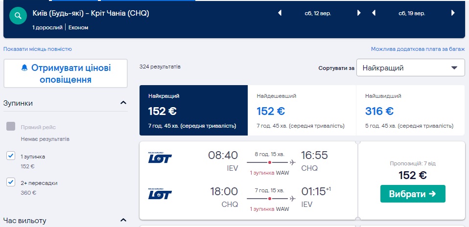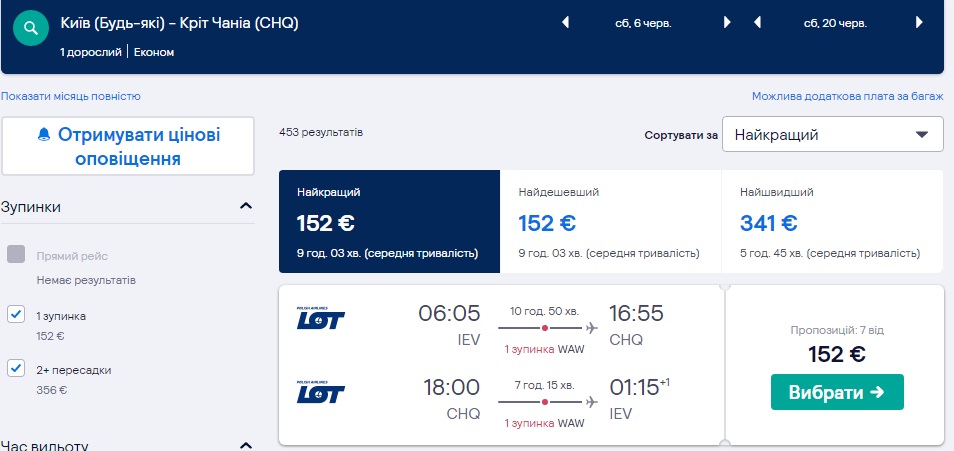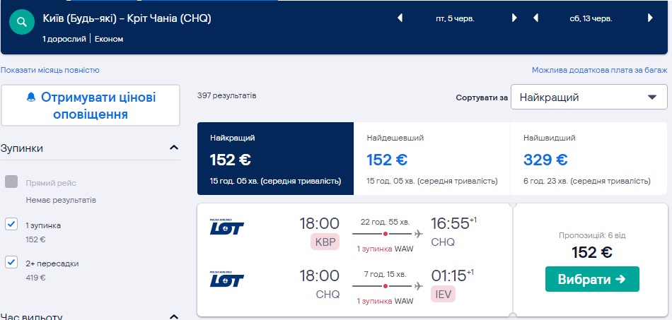 Вартість квитків Київ-Ханья – від €152 в обидві сторони. Рейси здійснюються з пересадками у Варшаві.