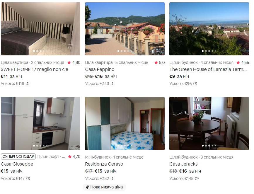 Приклади бронювання житла у Ламецію-Терме на період 16.05.2020 — 24.05.2020, 8 ночей: