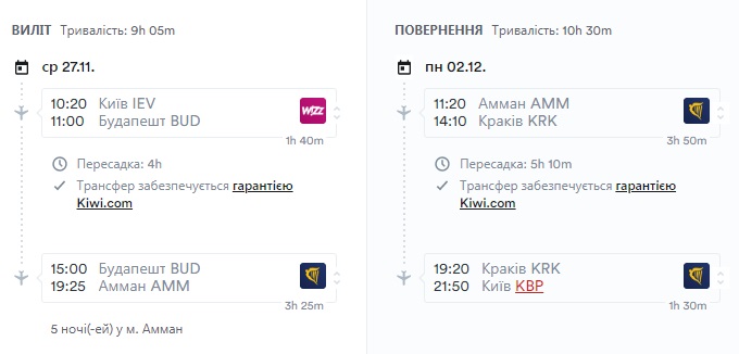 Підбирати вигідні дати для подорожей з жовтня по грудень 2019. Рейси до Йорданії здійснюються з пересадками у Пафосі, Будапешті або Кракові.