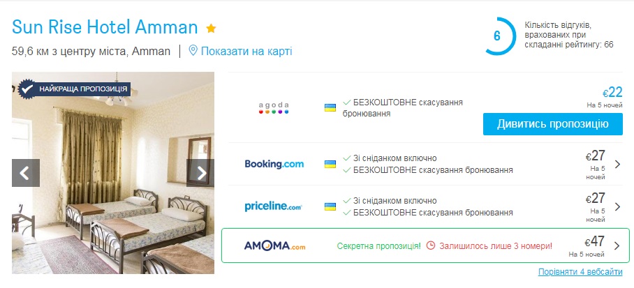 Для бюджетного проживання – Sun Rise Hotel Amman – від €22 за місце у хостелі.