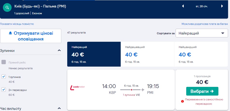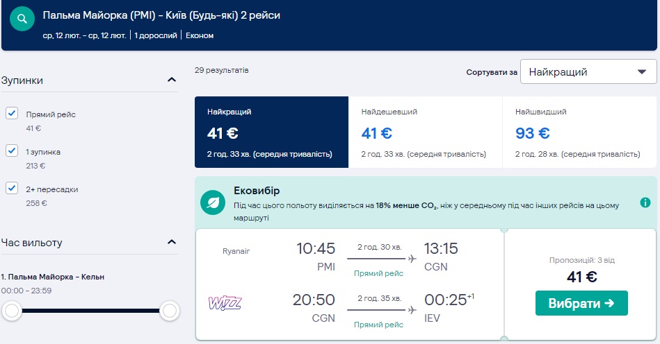 Підбираємо рейси у лоукостів Ryanair, Wizz Air, Laudamotion та Сondor і летимо з Києва на Майорку – від €37 в один бік та €78 в обидві сторони. Переліт здійснюється з пересадками в Німеччині та Австрії.