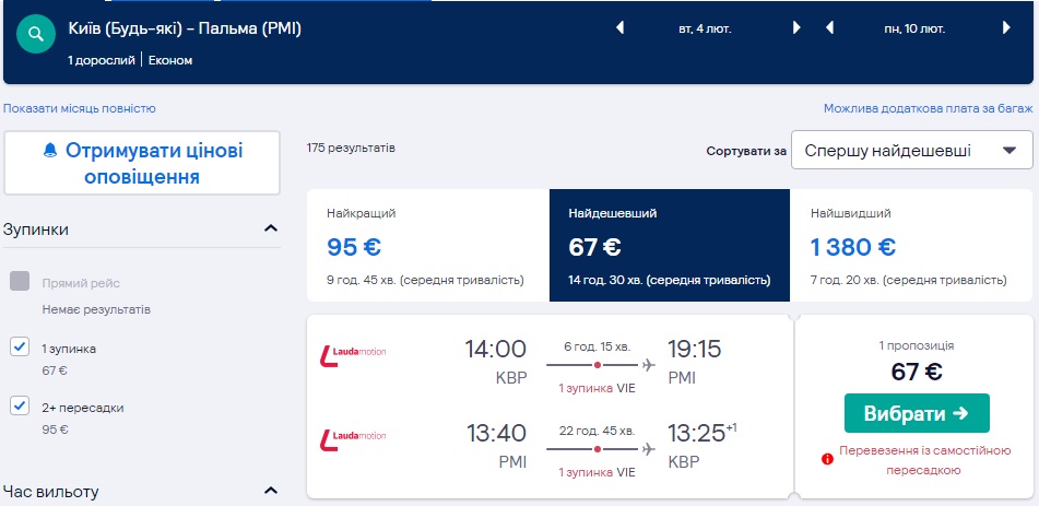 Комбінуємо авіарейси Ryanair і Laudamotion та летимо з Києва на Майорку – від €67 в обидві сторони з пересадками у Відні, Мадриді або Карлсруе.