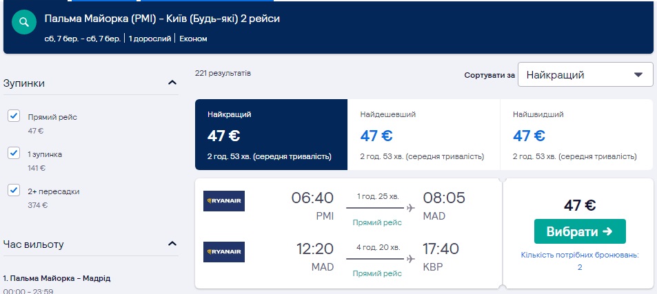 Пальма-Мадрид-Київ (07.03.2020) – €47